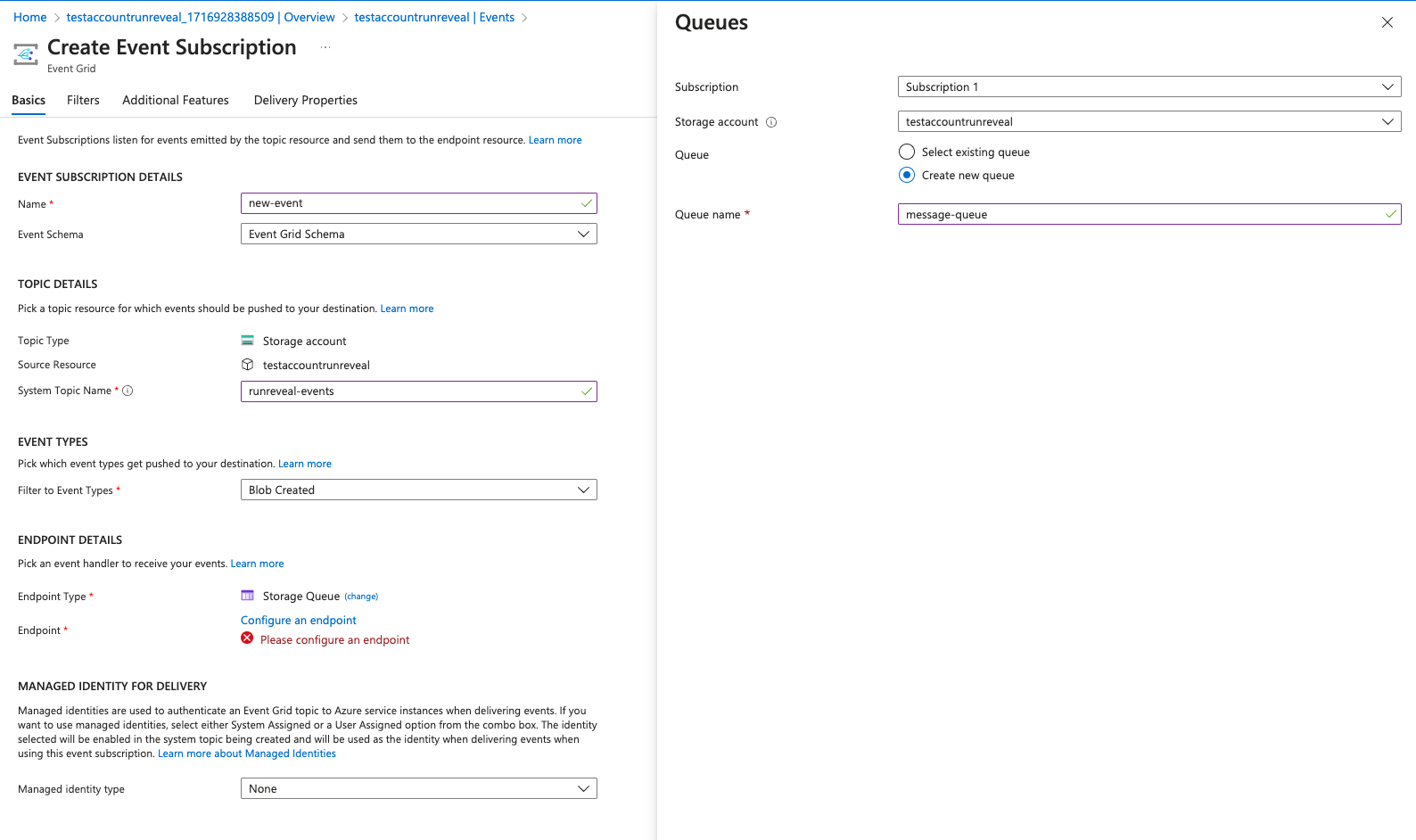 Make sure to take note of the name of the storage queue that was created as this will be needed in the RunReveal source.